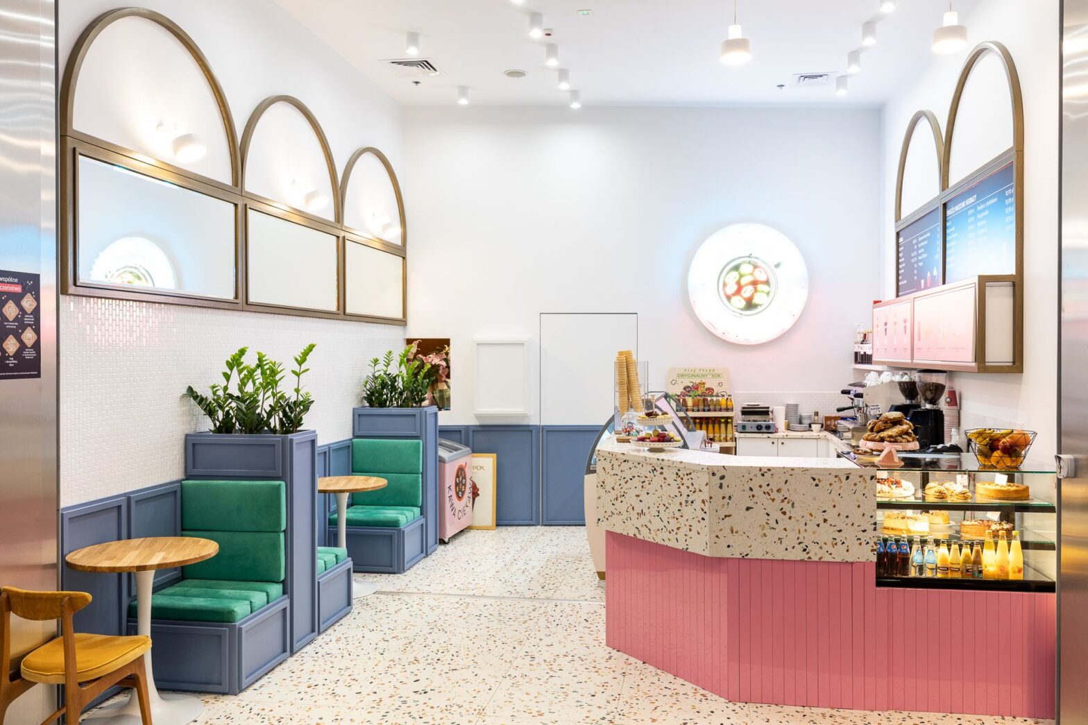 Kolorowa kawiarnia z elementami lastryko, która wyróżnia się francuskim szykiem.