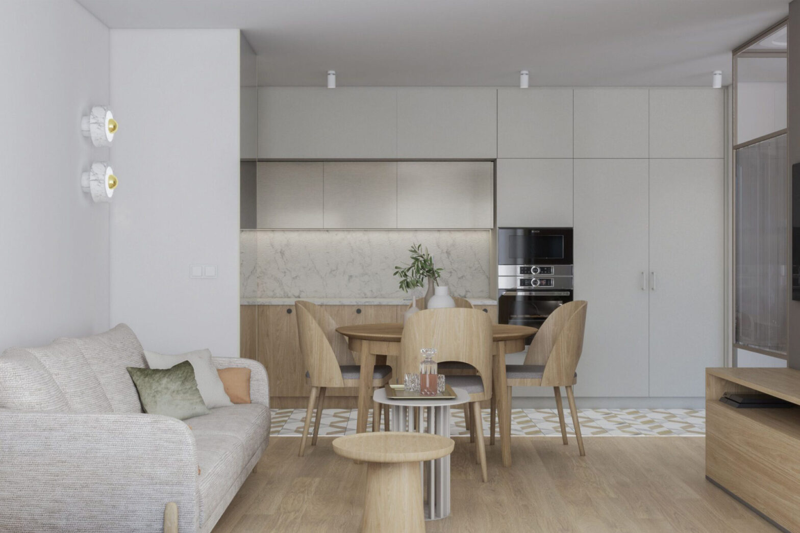 Mieszkanie dla pary ceniącej stonowane kolory, harmonię i funkcjonalność. Priorytetem było zaprojektowanie przestrzeni do home office oraz dodatkowa sypialnia dla gości-która na co dzień, nie zmniejszy przestrzeni użytkowej domownikom. Zaproponowane rozwiązanie to znikający za narożnymi, przeszklonymi drzwiami pokój, który po rozsunięciu drzwi pozostaje integralną częścią salonu.