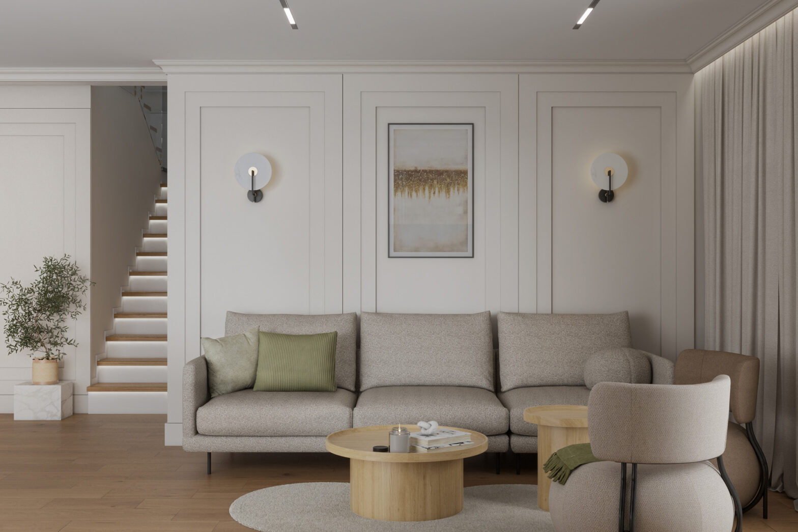 Projekt eleganckiego domu pod miastem dla trzy osobowej rodziny. Na parterze zostały połączone gusta i potrzeby rodziny, natomiast na piętrze dla każdego stworzyliśmy jego wymarzoną strefę, dbając jednak o spójność całej inwestycji, aby dom zachował elegancje i charakter.